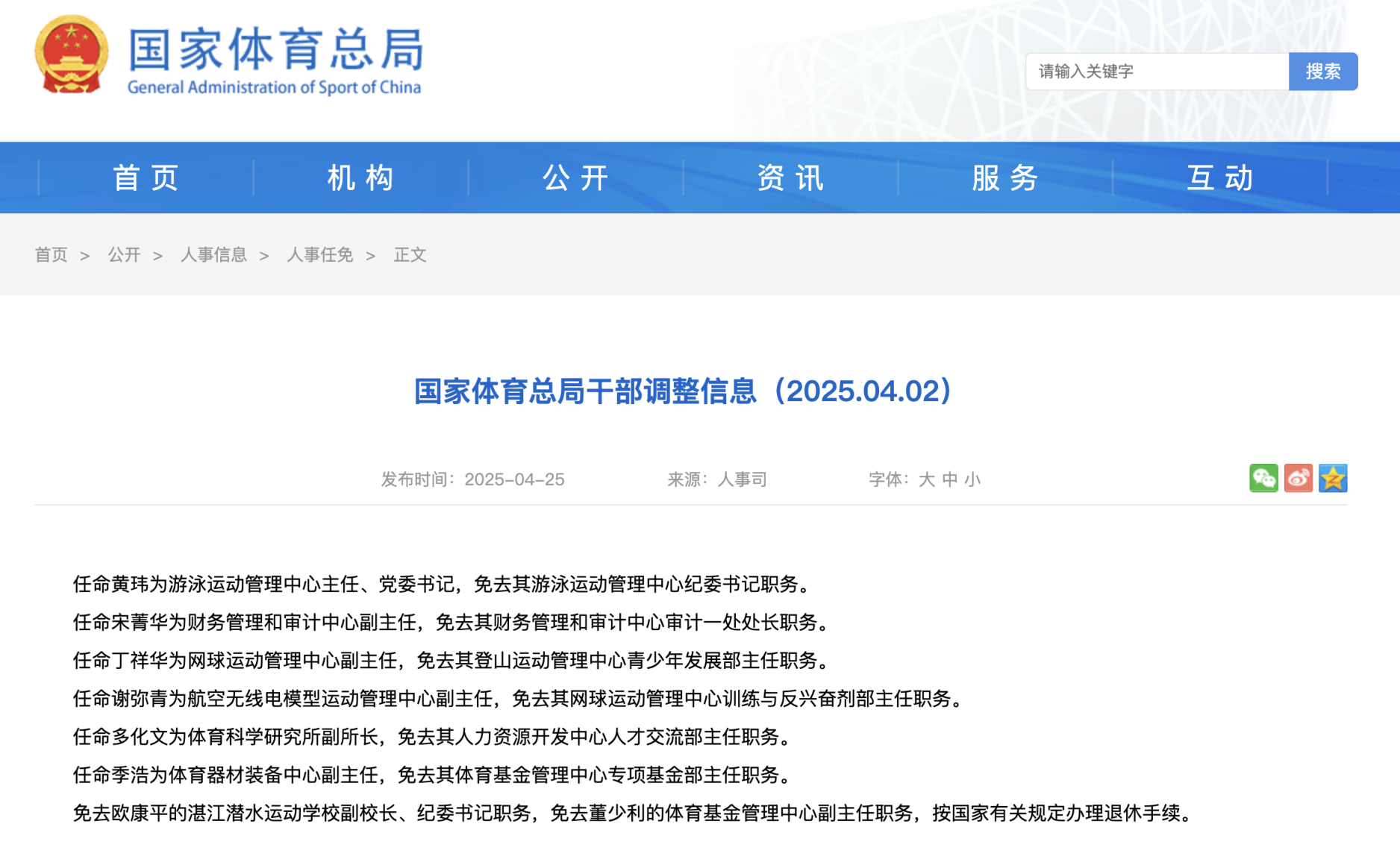 发布日期:2025-05-25 01:51 点击次数:141近日,国家体育总局网站发布干部调整信息。其中,任命黄玮为游泳运动管理中心主任、党委书记,免去其游泳运动管理中心纪委书记职务。